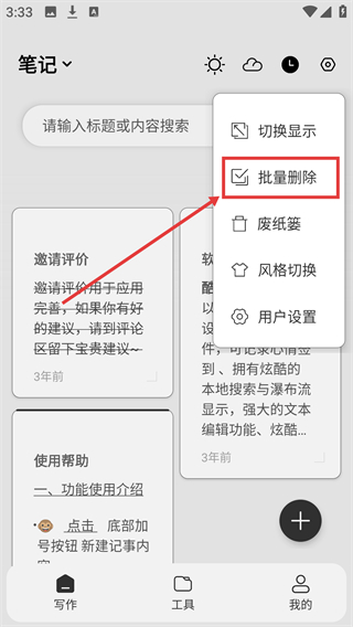 2、展开功能菜单后,选【批量删除】选项,能进入笔记批量选择页面,准备管理冗余笔记啦。