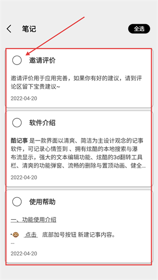 3、进入批量选择页后,可勾选想要处理的笔记,这样就能对选中的笔记进行统一操作啦。