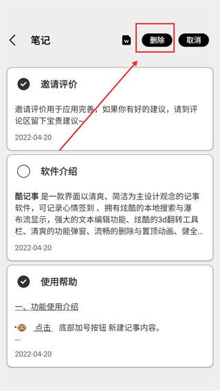 4、勾选好目标笔记后,点右上角的【删除】按钮,就能批量移除选中的笔记,整理页面啦。
