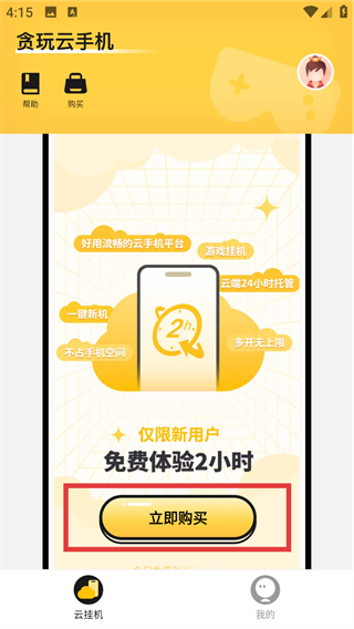 1、在【贪玩云手机】主页面点击【立即购买】按钮,就能进入新机选购界面,开启云手机的购买流程啦。