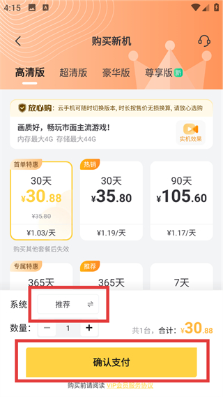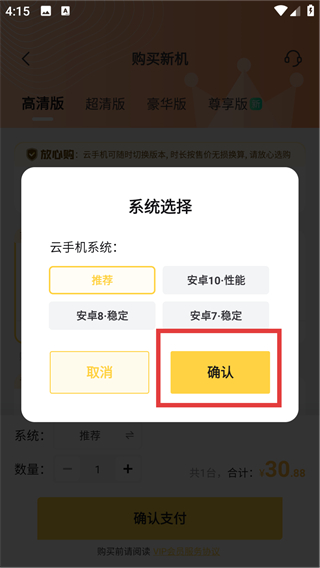 2、进入【购买新机】页面选好套餐与系统后,点击【确认支付】按钮,就能进入系统选择的弹窗界面咯。