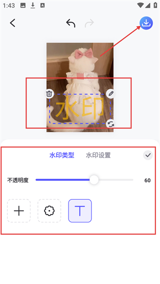 3、添加水印后,可调整水印的不透明度等参数,设置满意后点击右上角图标就能保存图片哦。