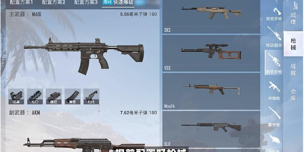 进入对局前,玩家可以通过限时模式-快速爆破-枪械设置,提前配置好自己的对局枪械。