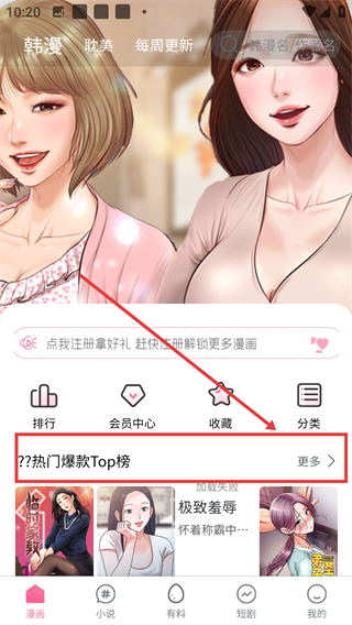 1、在APP的首页,点击【热门爆款Top榜】区域,可查看热门漫画列表,找到心仪的作品准备阅读啦。