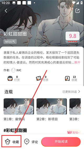 3、在漫画详情页,点击底部的【收藏】按钮,可将该漫画加入收藏列表,方便后续快速找到哦。