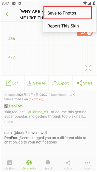 4、在展开的选项中选择【Save-to-Photos】,就能把这个皮肤保存到设备相册里,后续随时能用哦。