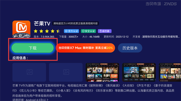 2、进入【芒果TV】详情页后点击绿色【下载】按钮,就能开始下载这个应用,后续可在设备上使用哦。