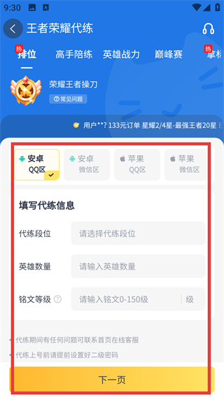 2、在代练信息页选择对应区服,填写代练段位、英雄数量等信息后,点击【下一页】就能进入订单确认页哦。