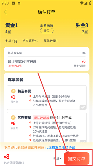3、在确认订单页核对代练信息和套餐后,点击【提交订单】按钮,就能触发后续的认证提示啦。
