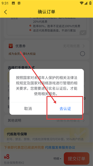 4、提交订单后会弹出实名认证提示,点击【去认证】按钮完成认证,才能继续使用代练服务哦。