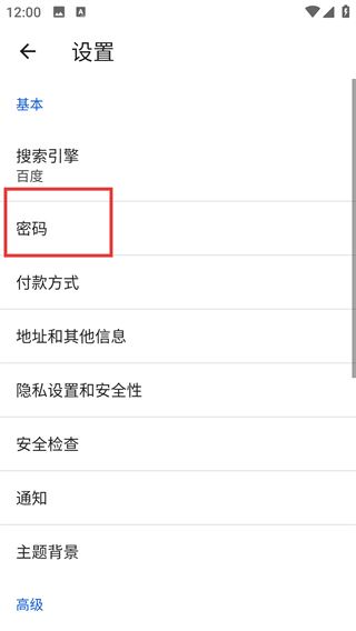 3、进入设置页后点击【密码】选项,就能进入密码管理界面,调整密码相关的功能开关啦。