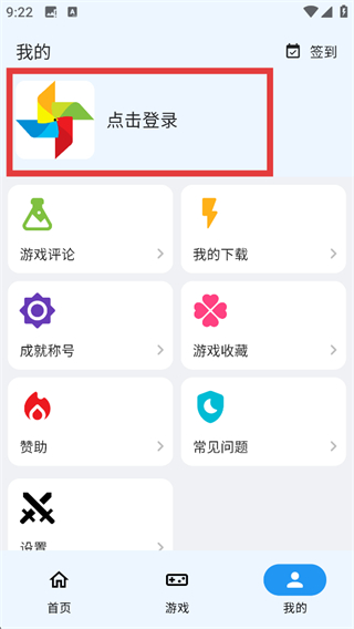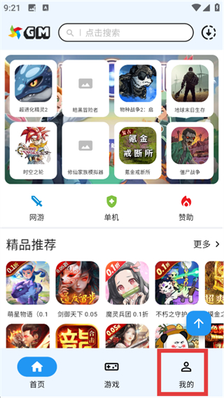 1、游戏类APP首页点击红框标注的【我的】按钮,进入个人中心页面。