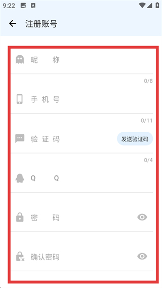 4、注册账号界面红框区域需依次填写信息完成注册。