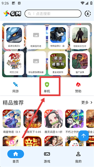 1、游戏类APP首页点击红框标注的【单机】选项,进入单机游戏列表页面。