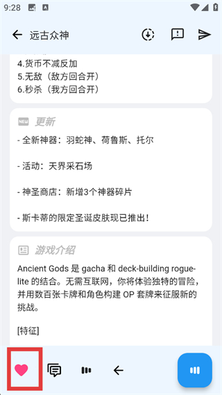 4、【远古众神】详情页下滑后,点击红框标注的爱心图标收藏该游戏。