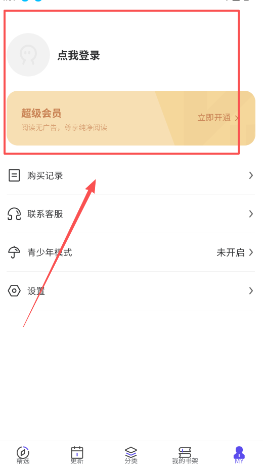 1、首先呢,在首页就能看到登录入口和会员权益介绍,阅读无广告是主要卖点,点击封面就能直接开始阅读。