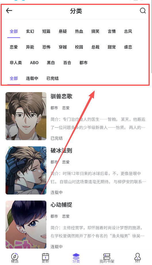 2、如果想找特定类型的漫画,可以点击底部导航的分类按钮,页面里详细列出了玄幻、悬疑、恋爱、校园等众多标签。