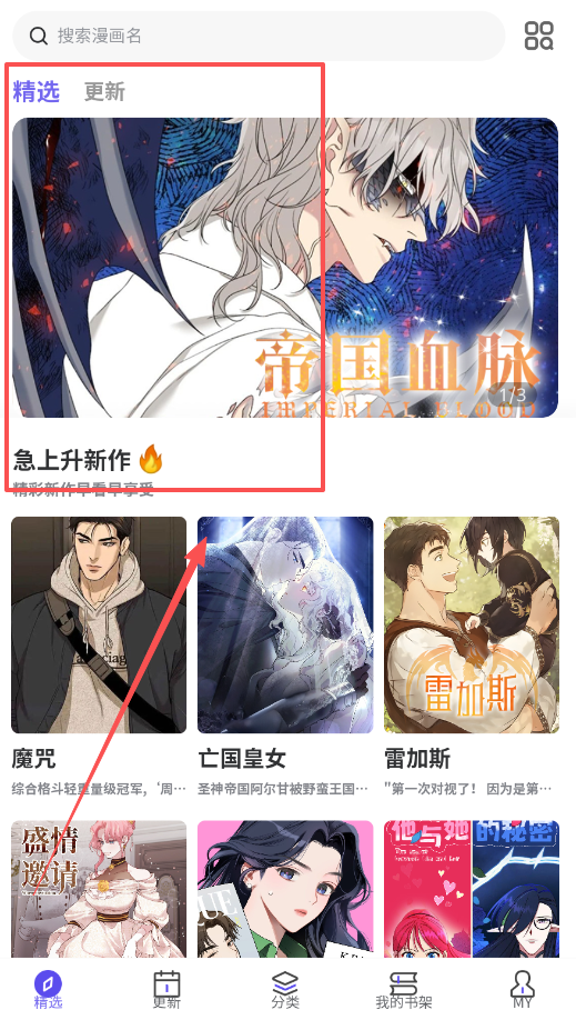 4、当然了,你也可以使用顶部的搜索功能,直接输入漫画名称进行查找。搜索发现或许还能给你一些灵感。