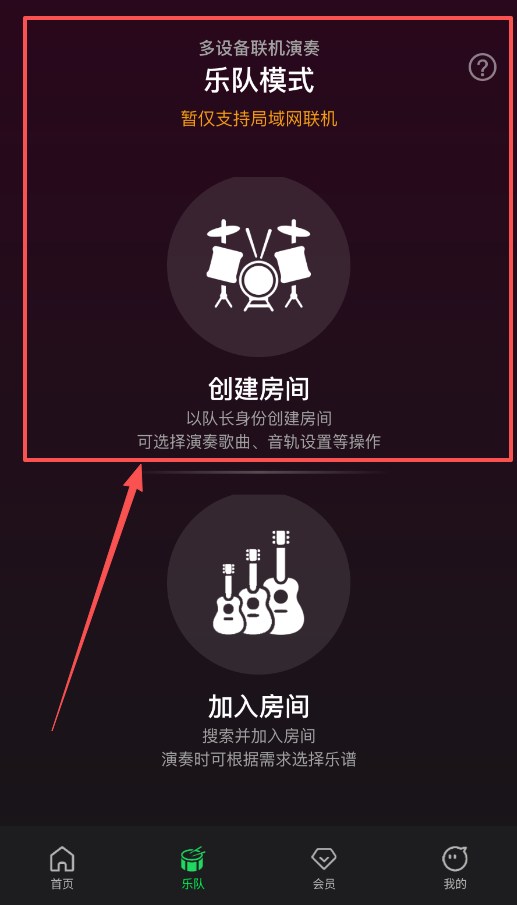 3、想和朋友合奏,可以点击底部“乐队”进入乐队模式,由一人创建房间选择歌曲,其他人在局域网内搜索加入,即可开始联机演奏。
