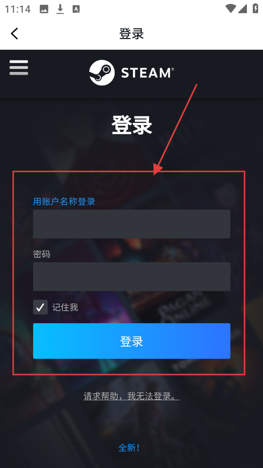 3、在Steam登录页面,输入账户名称和密码,点击【登录】按钮,可完成Steam账号登录哦。
