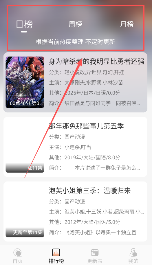 2、找热门动漫的话,可以点进排行榜,这里分日榜和周榜,还能了解分类、主演和评分,帮你快速找到想看的。