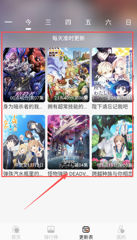 3、想追更的话,就点更新表,这里按日期列出了番剧的更新情况,比如每天几点更新、更新到第几集、是否完结。