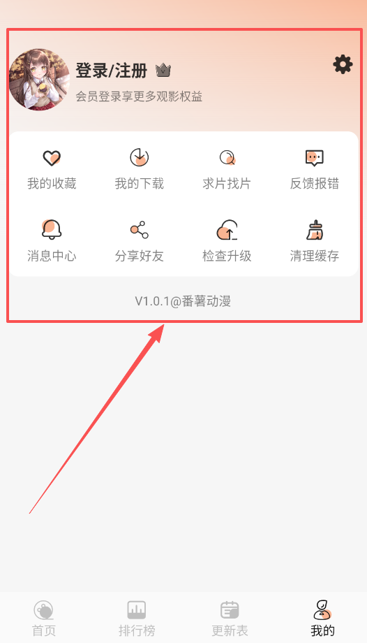 4、管理个人内容时,点右下角的我的,这里可以登录注册,还能查看我的收藏、我的下载,进行求片找片、清理缓存等操作。