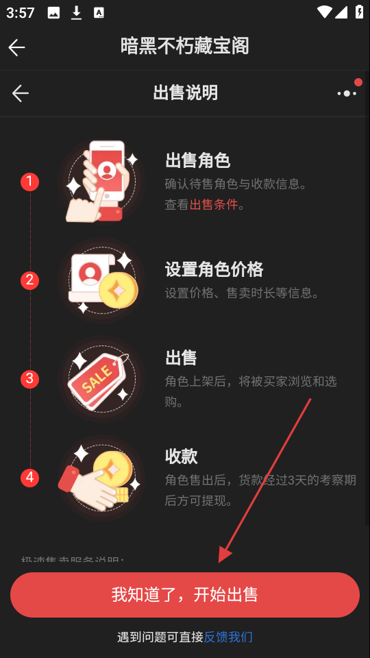 2、在出售说明页面,了解出售流程后,点击【我知道了,开始出售】,就能进入区服选择页面哦。