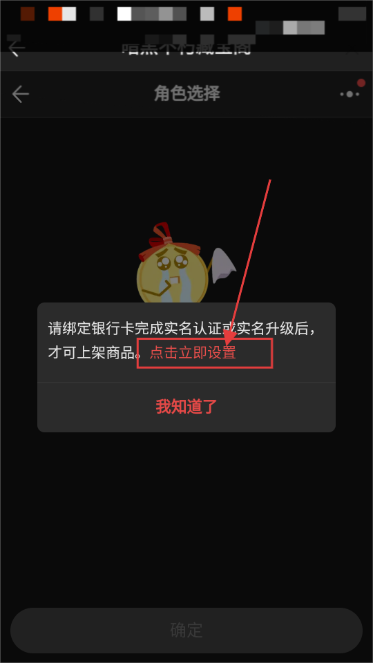 4、进入角色选择环节,若需绑定银行卡完成实名认证,点击【点击立即设置】,就能继续卖号啦。
