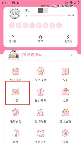 2、进入个人中心后点【主题】选项,能进入主题设置界面,可更换界面的主题样式哦。