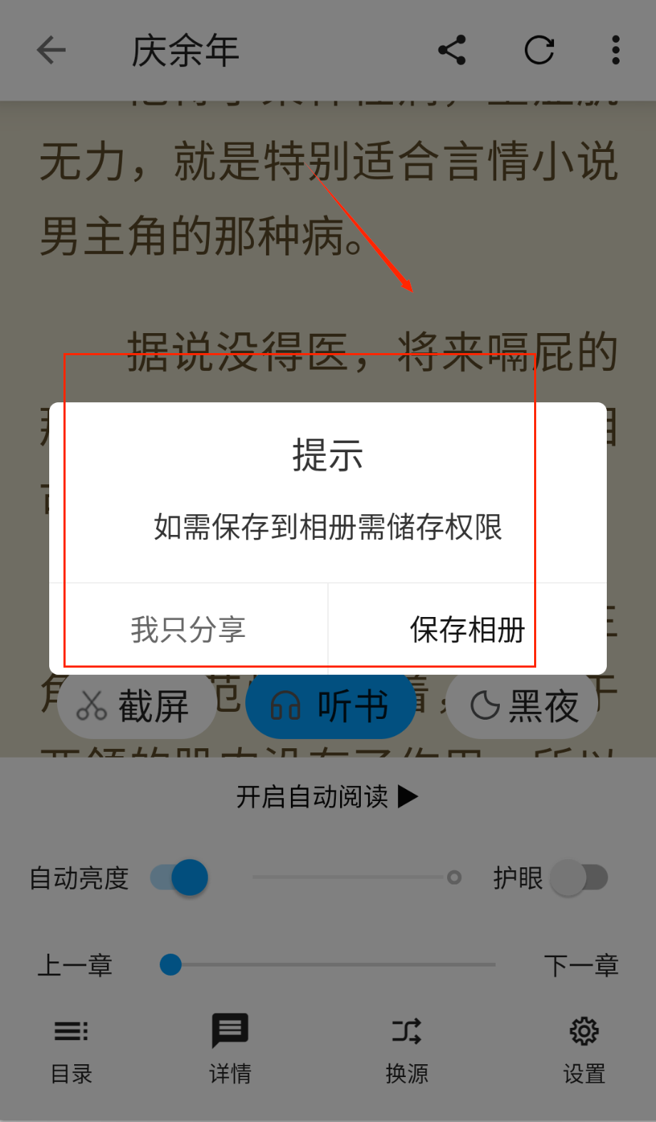 3、碰到精彩情节想留存,使用“截屏”功能轻松捕捉,授权存储权限后通过“我只分享”选项就能快速保存至相册或转发给好友啦。
