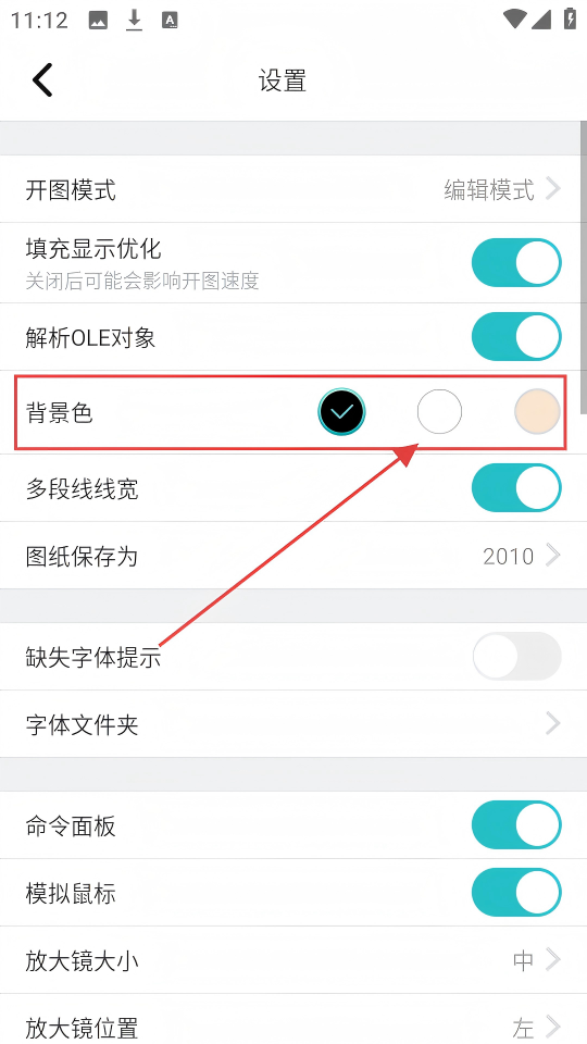 3、进入设置,找到【背景色】选项,有不同颜色可选,选白色背景,能让图纸显示更清晰呢。