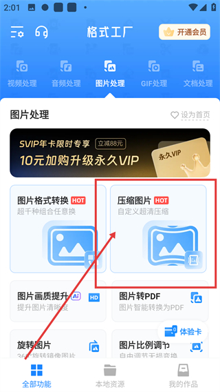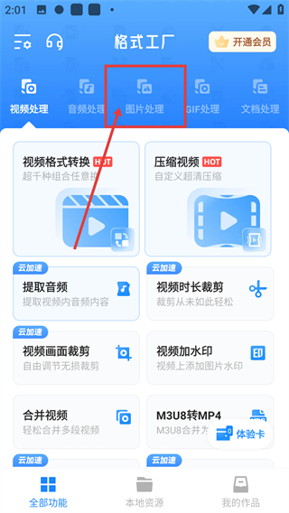 1、在格式工厂APP的全部功能页,点击顶部的【图片处理】选项,切换到图片类功能的操作界面啦。