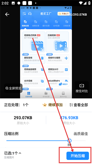 3、选定目标图片并进入压缩设置页,调整压缩比例后,点击【开始压缩】按钮,触发处理方式的弹窗提示呀。