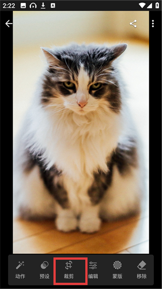 2、进入照片编辑页后点底部的【裁剪】选项,能开启裁剪功能,后续可调整照片的角度哦。