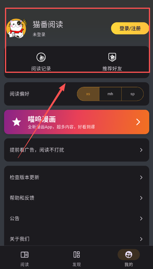1、打开猫番阅读,首先点击底部“阅读”标签完成登录,这样你的阅读记录和收藏就不会丢失了。