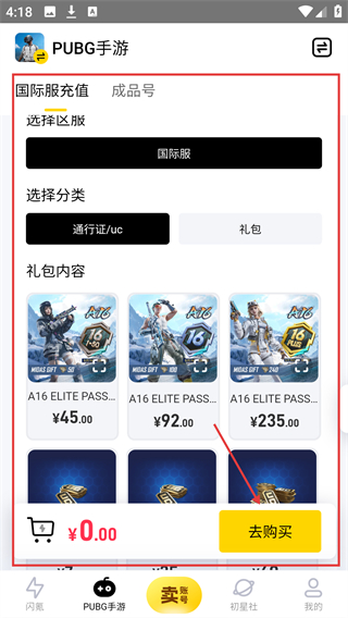 2、进入PUBG手游页面后,选择对应区服与分类,挑选想要的礼包内容,点击【去购买】即可进入结算流程哦。
