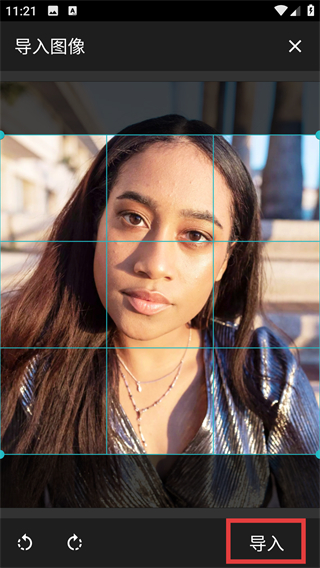 3、在导入图像界面选中目标图片,调整好裁剪范围后点击【导入】,就能将图片添加到画布啦。