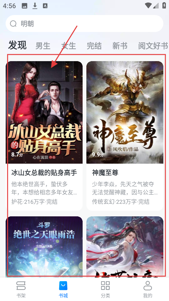 1、在书城发现页面,有好多小说推荐呀,像【冰山女总裁的贴身高手】等,挑选喜欢的小说点击进入详情页就行啦。