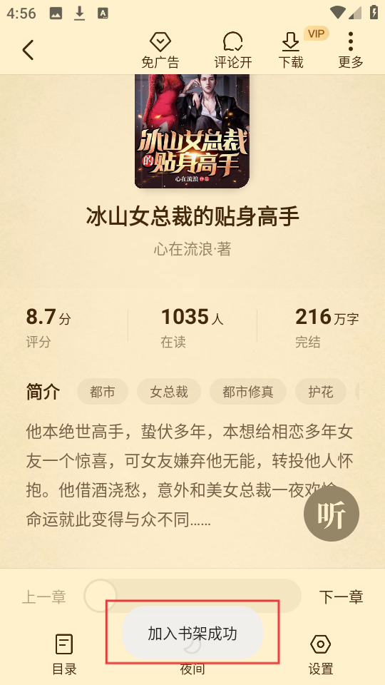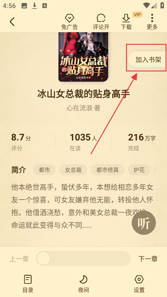 2、进入小说详情页后,看到右上角的【加入书架】按钮,点击它就能把小说加入书架,方便之后查看哦。