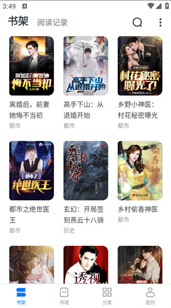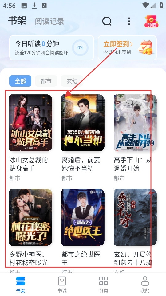4、之后去书架页面,就能看到刚才加入的小说,像【冰山女总裁的贴身高手】就乖乖在书架里,随时可以阅读哟。