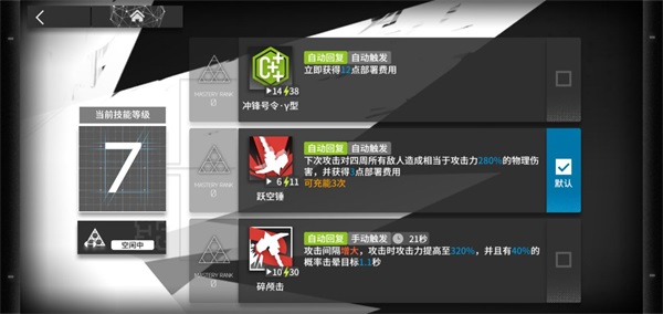 过载模式(专精后才会增加攻击力):常应用于高压开局、针对boss的迅速击杀或者是复杂快速清场,有着较强的降压能力,但由于该技能的攻击提升效果不明显,导致面对物抗较高的敌方单位时会被迫沦为“抛光机”,且自动化设定致使需要对整体节奏有所掌握