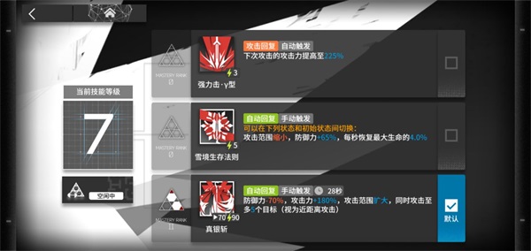 真银斩:高强度的范围物伤效果能够对附近的数名敌方单位造成迅速击杀的效果,且物伤之高,即便是敌方重装单位通常也很难抵挡,是极速降压的必备手段;但同时在技能释放期间,银灰的物抗会衰减严重,因此需要为其提供安全的输出站位