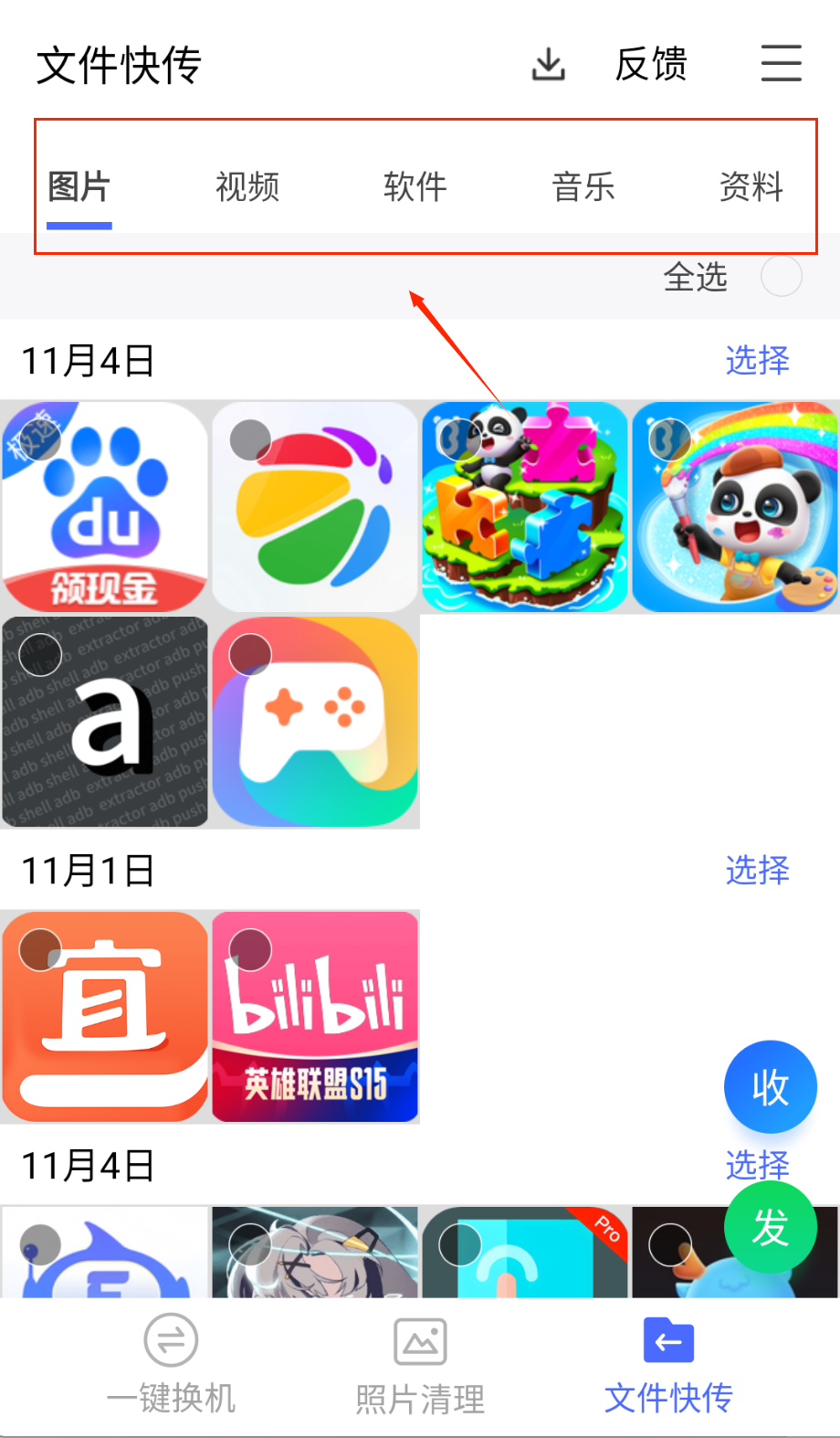 2、使用文件快传时选择要发送的文件类型,图片视频等分类清晰,选中文件后点击发送,接收方在同一网络下打开软件即可接收。