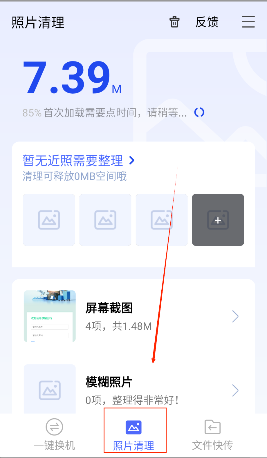 1、打开软件后首先在主页选择需要的功能模块,比如文件快传可以快速传输图片视频等文件,照片清理能释放手机存储空间。