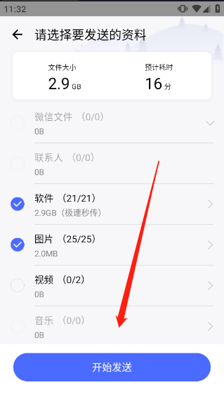 2、点击勾选需要发送的资料,点击【开始发送】。