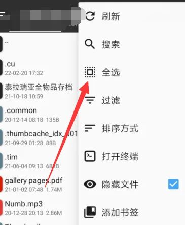 四、第二种方法,该方法比较简单,右滑任意分屏中的文件,可选中该文件,然后点击左下角全选键。