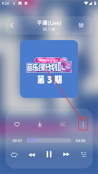 2、进入播放页后,点右下角三点按钮,就能展开操作菜单,查看更多歌曲相关功能哦。