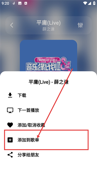 3、在操作菜单里选【添加到歌单】选项,就能进入歌单选择界面,把歌曲归类到歌单啦。