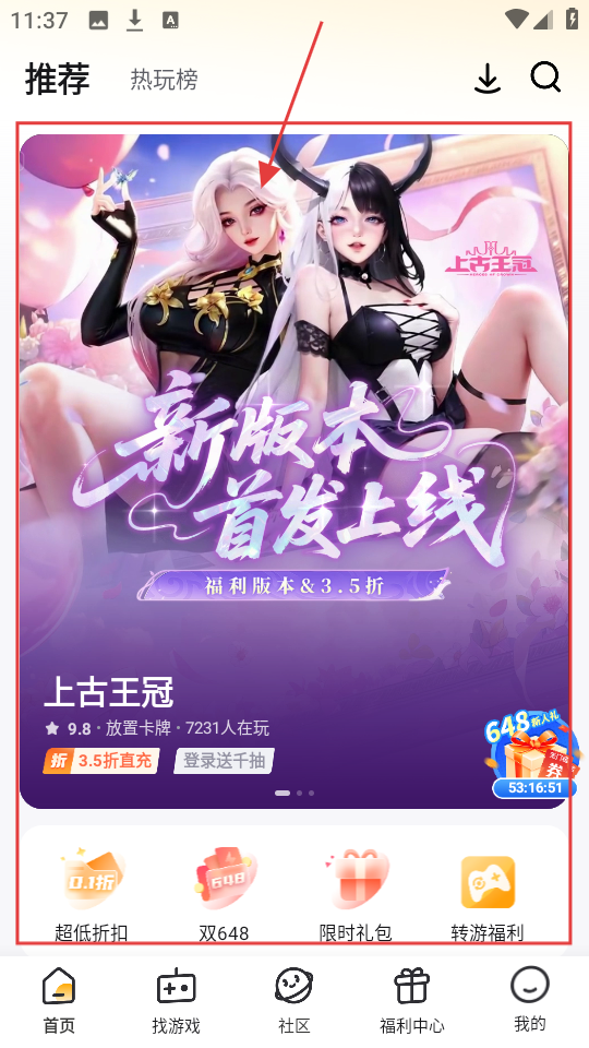 1、首页推荐的【上古王冠】新版本首发,3.5折很划算,快看看游戏详情吧。